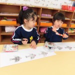 年少たんぽぽ組と満3歳児もも組のお友だちが、初めて版画(ステンシル)に挑戦しました。