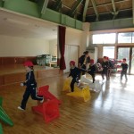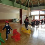 倒したコーンにぶつからないように走ったり、両足でピョンピョン跳んだり・・・