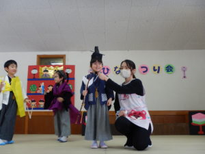子どもたちは、雛人形の中で自分がなりたい人に変身しました。